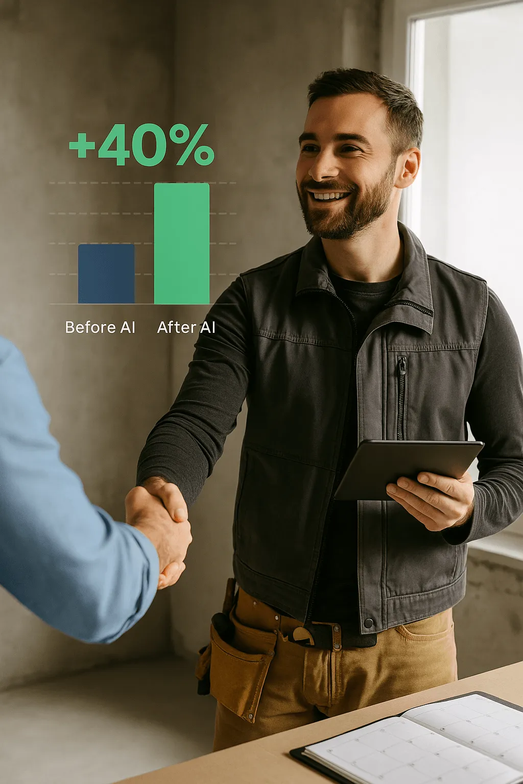A: The AI Chat Bot lives on your website and engages visitors instantly, answering questions, qualifying projects, and booking appointments directly into your calendar.